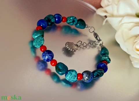 Krizokolla, lapis lazuli és korall ásványkarkötő kagyló medállal