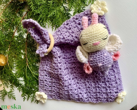 Horgolt lila baba pillangó plüss szundi kendővel és fa rágókával