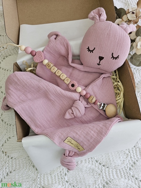 Első ajándékom - Mályva nyuszis szundikendő Babaváró ajándék Babaköszöntő ajándékbox