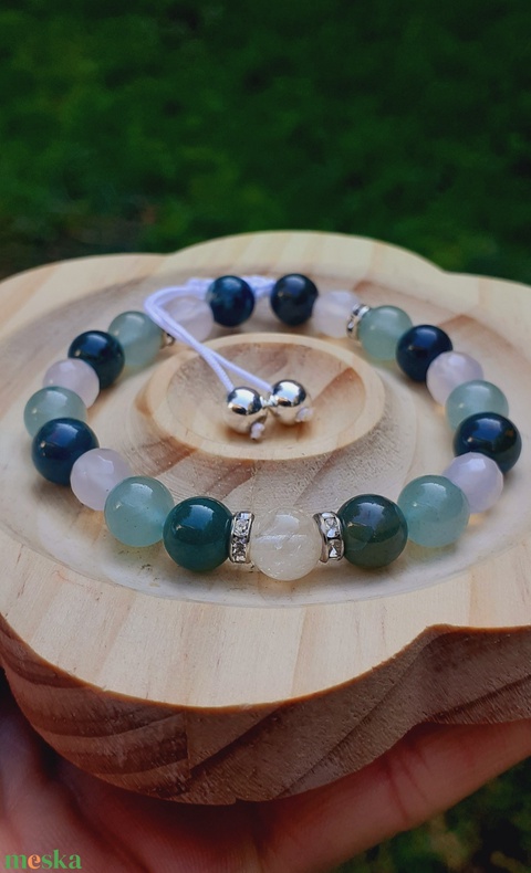 Ez a citrin, mohaachát, aventurin és fehér achát karkötő egyszerű, de hatásos kombináció, ha szeretnéd bevonzani a bőséget és közben megtartani a belső egyensúlyt. Állítható méretű, csomózásos technikával készült, így kényelmes viselet, akár a mindennapokban, akár különleges alkalmakra.