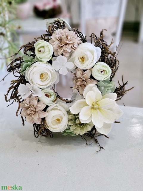 Fehér magnóliás tavaszi ajtódísz barna virágokkal