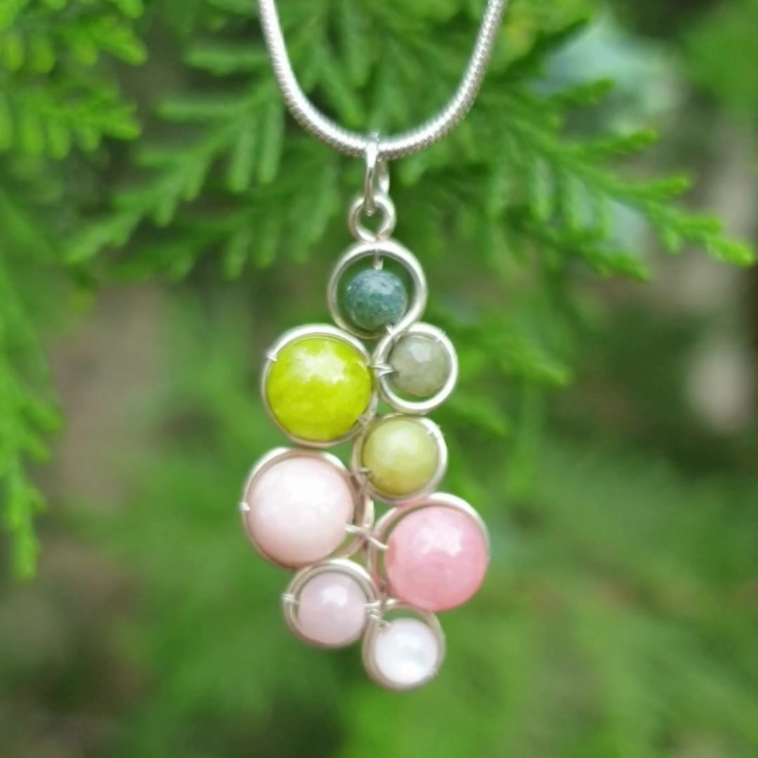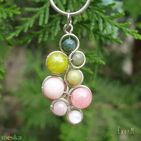 - Anyaga: ásvány, jáde, angelit, napkő, achát, ezüstözött ékszerdrót, kígyólánc, delfinkapocs