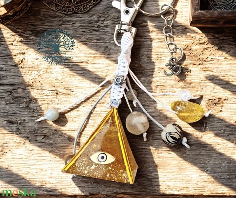 Orgonit ragyogás hegyikristály mini piramis kulcstartó. A lógókon citrin, cseresznye kvarc, amazonit, roppant ott kristály ásványgyöngyökkel. A piramis magassága 3 cm, csomózott résszel 6,5 cm, karikával 12 cm.