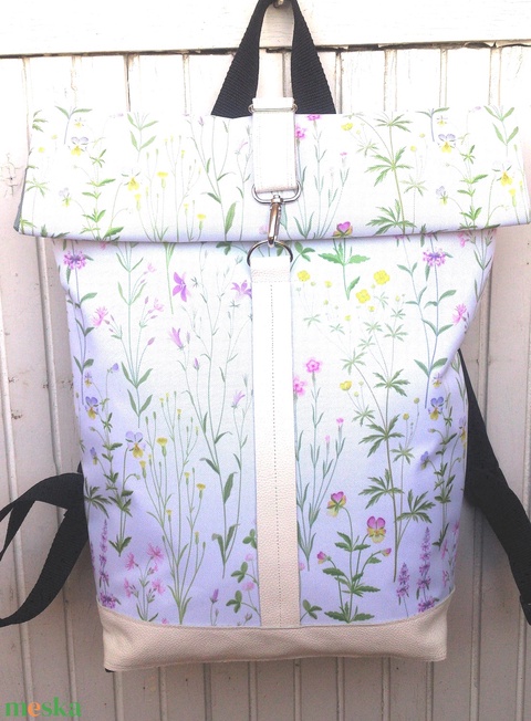 Fehér marhabőrrel, illetve fehér alapon virágmintás és világos zöld vízlepergető gyöngyvászonnal készült a táska eleje, háta fekete vastag vízálló szövet. Erős, jól pakolható hátizsák, kisebb laptop is elfér benne. A marhabőr betétek adják a táska egyedi, stílusos, egyben minőségi megjelenését is, a hétköznapokban is egyedi lehetsz.