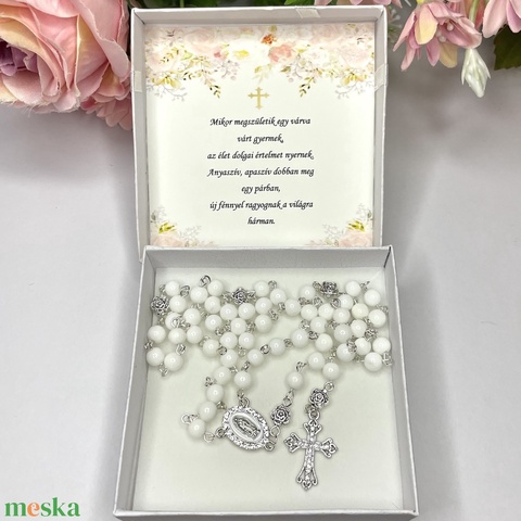 Keresztelő ajándék öttizedes ásvány rózsafüzér díszdobozban kísérő szöveggel lány gyermeknek 5516501