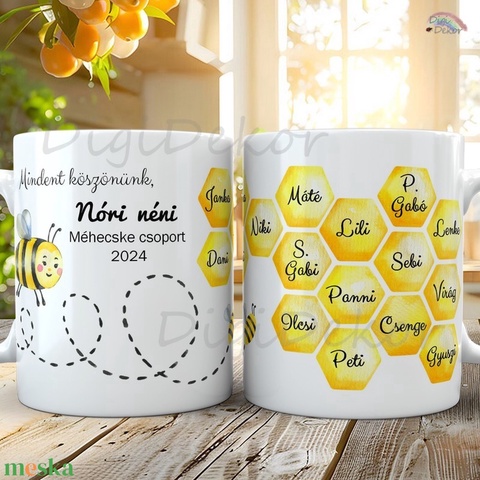 Névre szóló, méhecskés-méhsejtes bögre ovis ballagásra. Egyedi búcsúajándék.