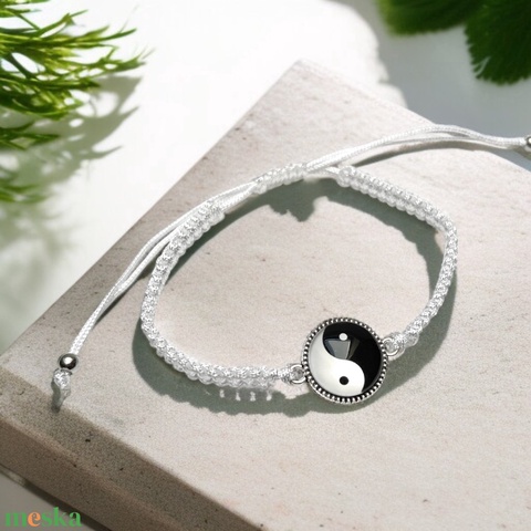 Csomózott makramé karkötő Jin-Jang üveglencsés medállal