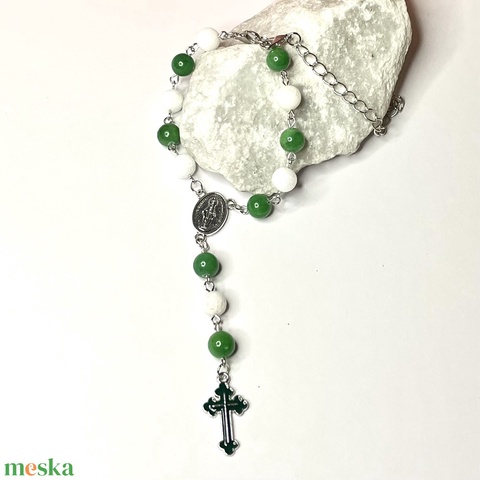 Zöld fehér fradis autós rózsafüzér, tizedes rózsafüzér hókvarc és jáde ásványból