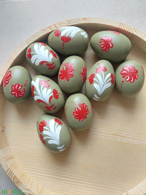 Kézzel festett fa tojás 9 db zöld- piros