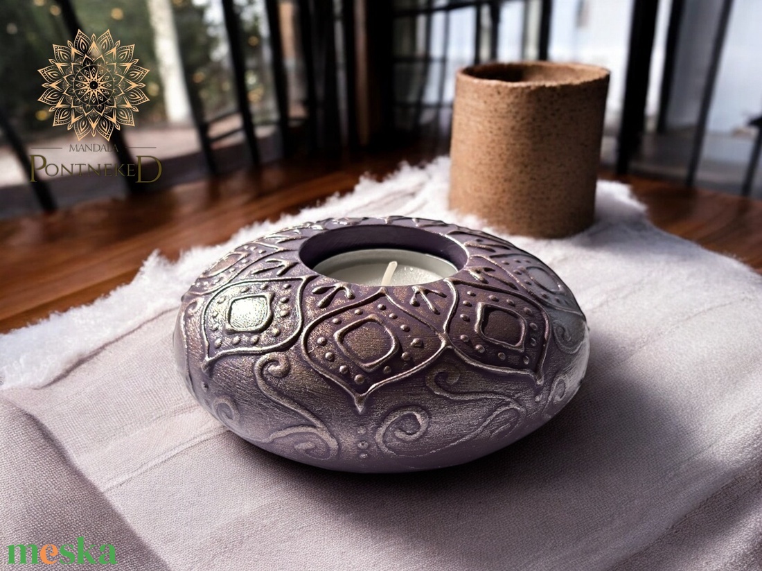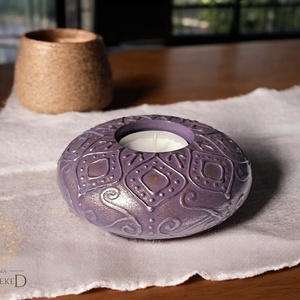 Rusztikus felületű, kerek, mandala mintás teamécses tartó (lila)