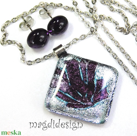 Lila szirmok ezüsben dichroic üvegékszer szett nyaklánc stiftes fülbevaló