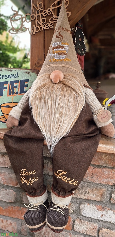 - Anyaga: pamutvászonkockás szövet, töltőanyag, kárpit textil, juta madzag, fából készült gomb, manószakáll