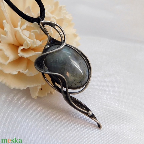 A medál Tiffany technikával készült labradorit, réz és ólommentes, ezüsttartalmú ón felhasználásával. A díszítés szintén saját készítésű, nem tartalmaz gyári elemeket. A fémrészt óezüstre patináztam és lelakkoztam, hogy sokáig szép maradjon.