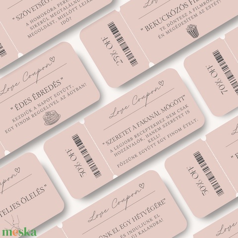 - Előre szerkesztett, esztétikus kuponokat romantikus, vicces és figyelmes ötletekkel.