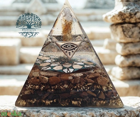Orgonit nap ereje piramis szabálytalan formájú citrin csúccsal, kép jáspissal, tigrisszemmel. A piramis 6 cm magas, 6 cm X 6 cm alapterületű.