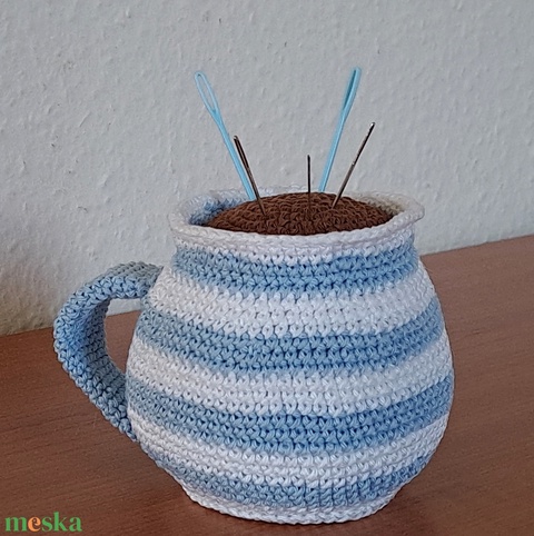 Horgolt csíkos bögre, tűpárna