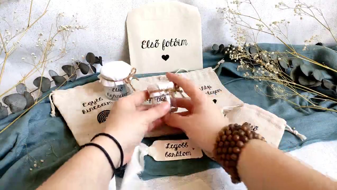 - Anyag/Összetevő kenderzsineg, vinyl, vászonzsák, üveg, textil, papírboríték, szalag, papír