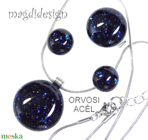 NEMESACÉL! Picikék aventurin csillogás üvegékszer szett, nyaklánc, gyűrű, pötty fülbevaló