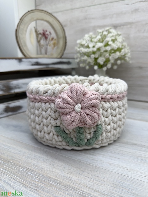 Tedd otthonod egyedivé ezzel a virágos mintájú, kézzel horgolt tároló kosárral! A kosár külsején elhelyezett gyönyörű virágok vidám hangulatot és stílust csempésznek bármelyik szobába – legyen szó nappaliról, gyerekszobáról, fürdőszobáról, konyháról vagy irodáról. Tökéletes választás, ha szeretnéd praktikus, de dekoratív módon tárolni a kis holmikat. A kosár alja fonalból készült, így mosógépben is könnyedén tisztítható.
