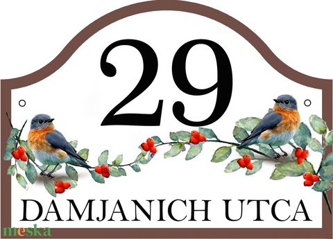 Bajusz formájú házszámtábla vörösbegy párral, bogyós ággal