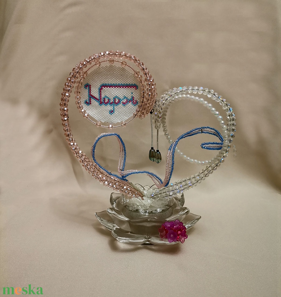 Gyöngyből készült szív névtáblával