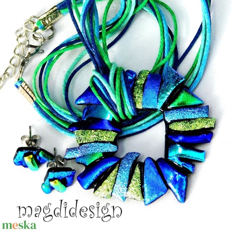 Csillogó kék-zöld-arany üvegékszer szett nyaklánc stiftes fülbevaló