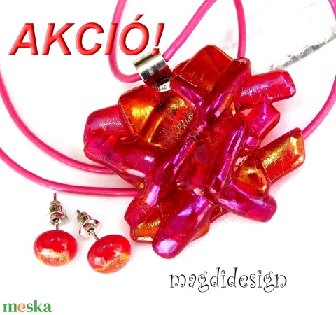 Arany-rubin borzaska eozin üvegékszer szett, nyaklánc, pötty fülbevaló