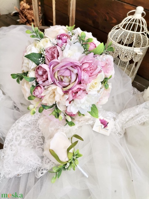 púder nude rózsaszín menyasszonyi csokor, örökcsokor, selyemvirág csokor kitűzővel (Gyöngy_pasztell)
