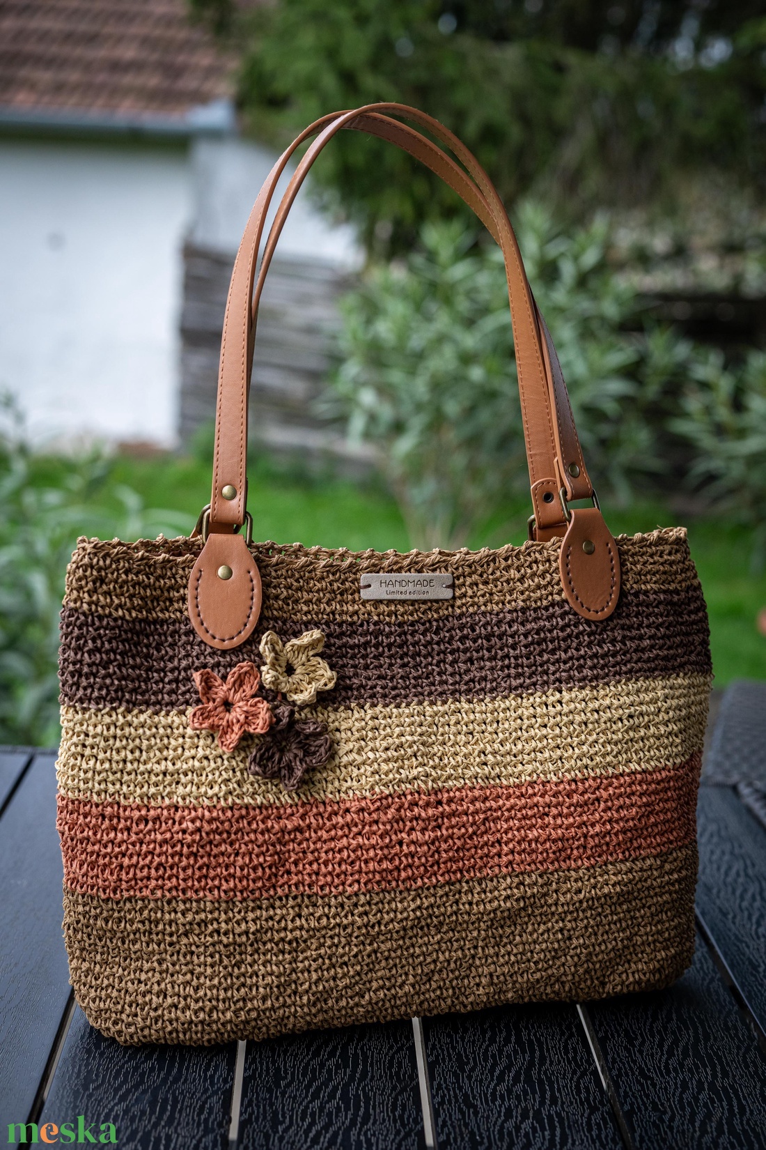 Csíkos rafia fonalból horgolt táska