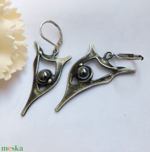 A fülbevaló tiffany technikával készült hematit, réz és ólommentes, ezüsttartalmú ón felhasználásával. A díszítés szintén saját készítésű, nem tartalmaz gyári elemeket. A díszítés szintén saját készítésű, nem tartalmaz gyári elemeket.A fémrészt óezüstre patináztam és lelakkoztam, hogy sokáig szép maradjon.