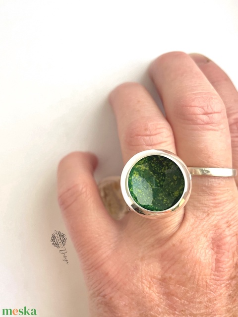 Csészegomba gyűrű- mohazöld pöttyös - ezüstözött réz ékszer
