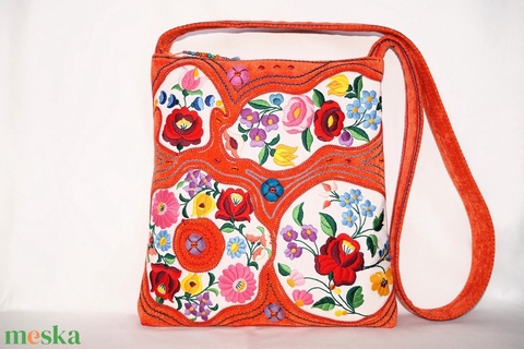 Színes, kézzel hímzett, kalocsai virágos, narancssárga, közepes méretű, cipzáros egyedi női válltáska belső zsebekkel 8.