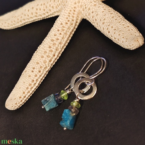 - Anyaga: köztes, nemesacél fülbevaló alap, nemesacél szerelék, nyers apatit, peridot, iolit