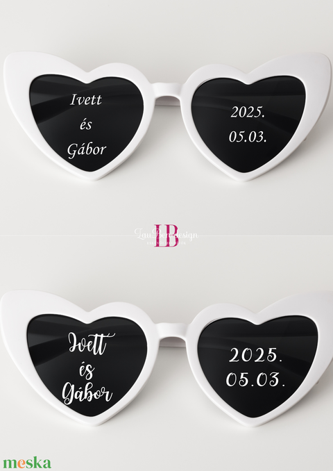 A minta képen látható mennyiségű szöveg fér el esztétikusan ezeken a szemüvegeken. Tehát kb a 2 név és egy dátum. Lehet a szöveg más, de a terjedelmét tekintve kb ennyi. A szemüveg pontos méretét illetve a feliratozható hely méretét te fogod megadni, annak megfelelően vágom majd méretre a kért szöveget.