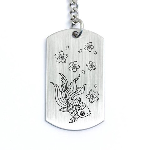 Aranyhal és cseresznyevirág gravírozott acél kulcstartó