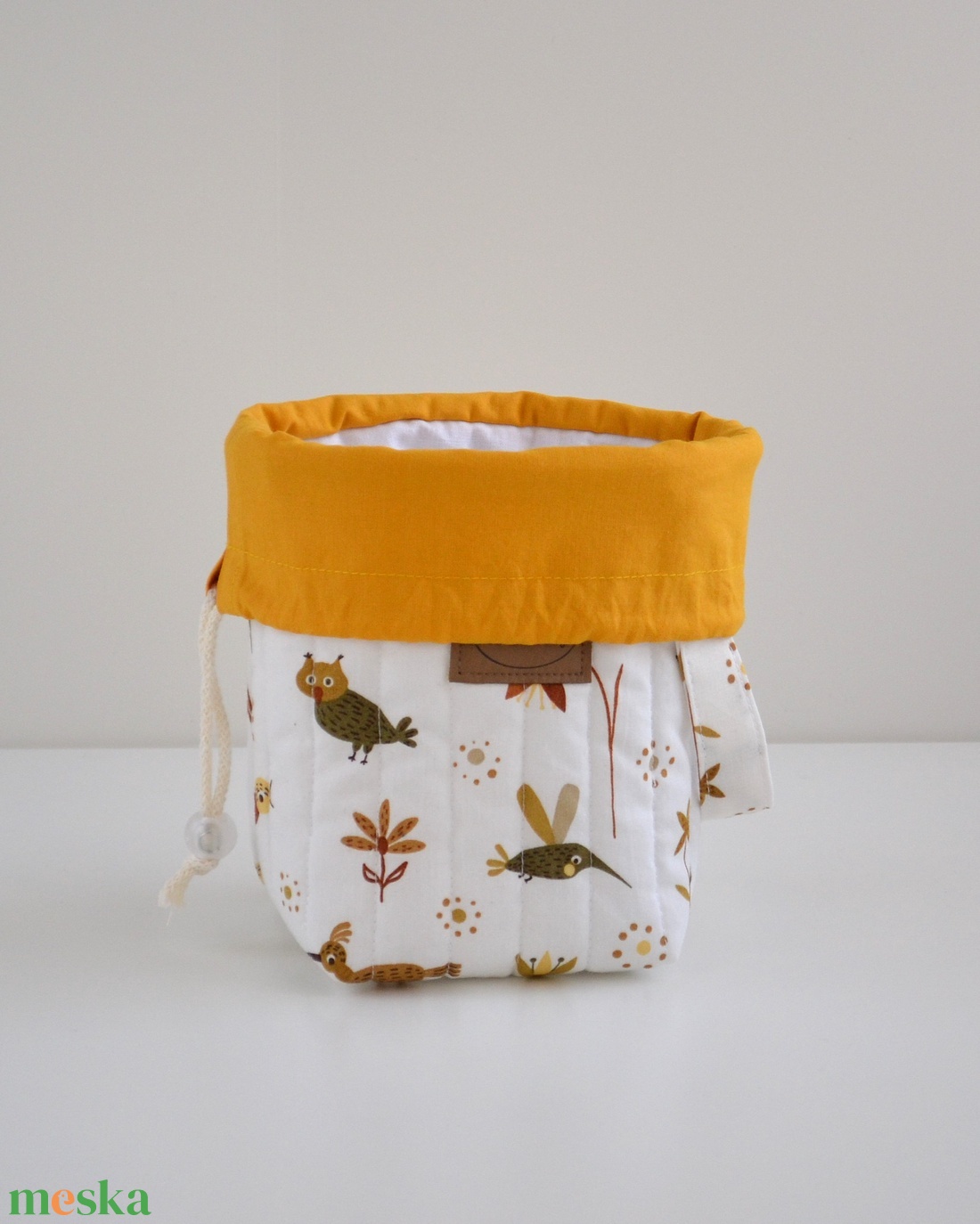 - Anyaga: pamutvászon, vlies, 100% újrahasznosított pamut zsinór, műanyag szerelékek (zsinórvég és patent)