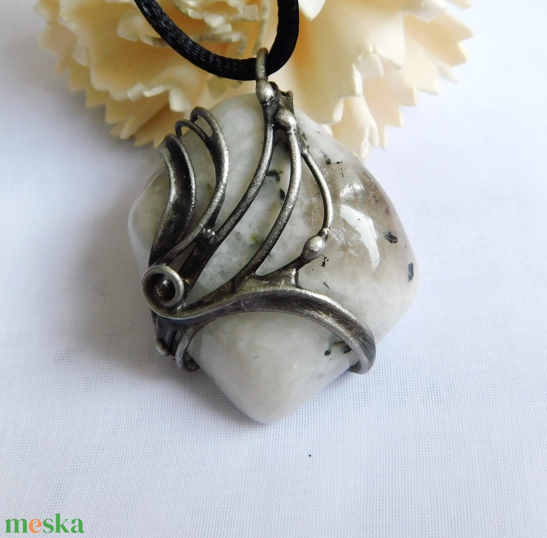 A medál Tiffany technikával készült szivárvány holdkő kaboson, réz és ólommentes, ezüsttartalmú ón felhasználásával. A díszítés szintén saját készítésű, nem tartalmaz gyári elemeket. A fémrészt óezüstre patináztam és lelakkoztam, hogy sokáig szép maradjon.