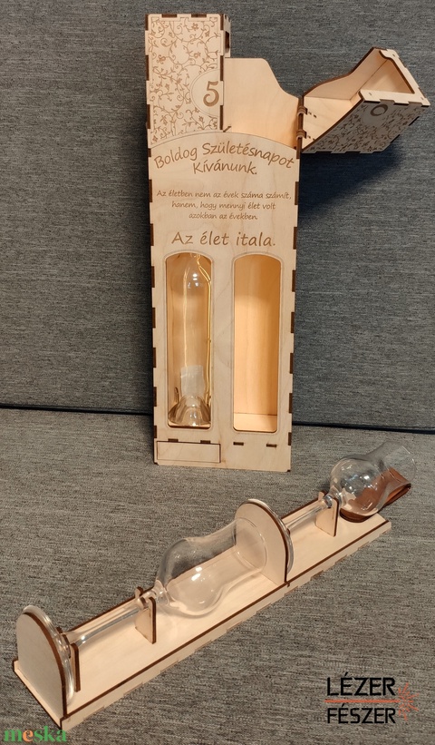 - Anyaga: 3mm vastag natúr nyír rétegelt lemez, pálinkás talpas pohár, 0.5 literes üveg dugóval