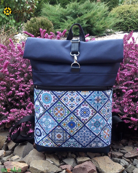 Csempe mintás sötétkék roll top hátizsák, vízálló - valódi bőrrel - ajándék - nagyobb méret