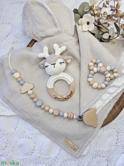 Első ajándékom Babaváró Ajándékbox Bézs szundikendő Cumilánc Macirágcsa Horgolt csörgő