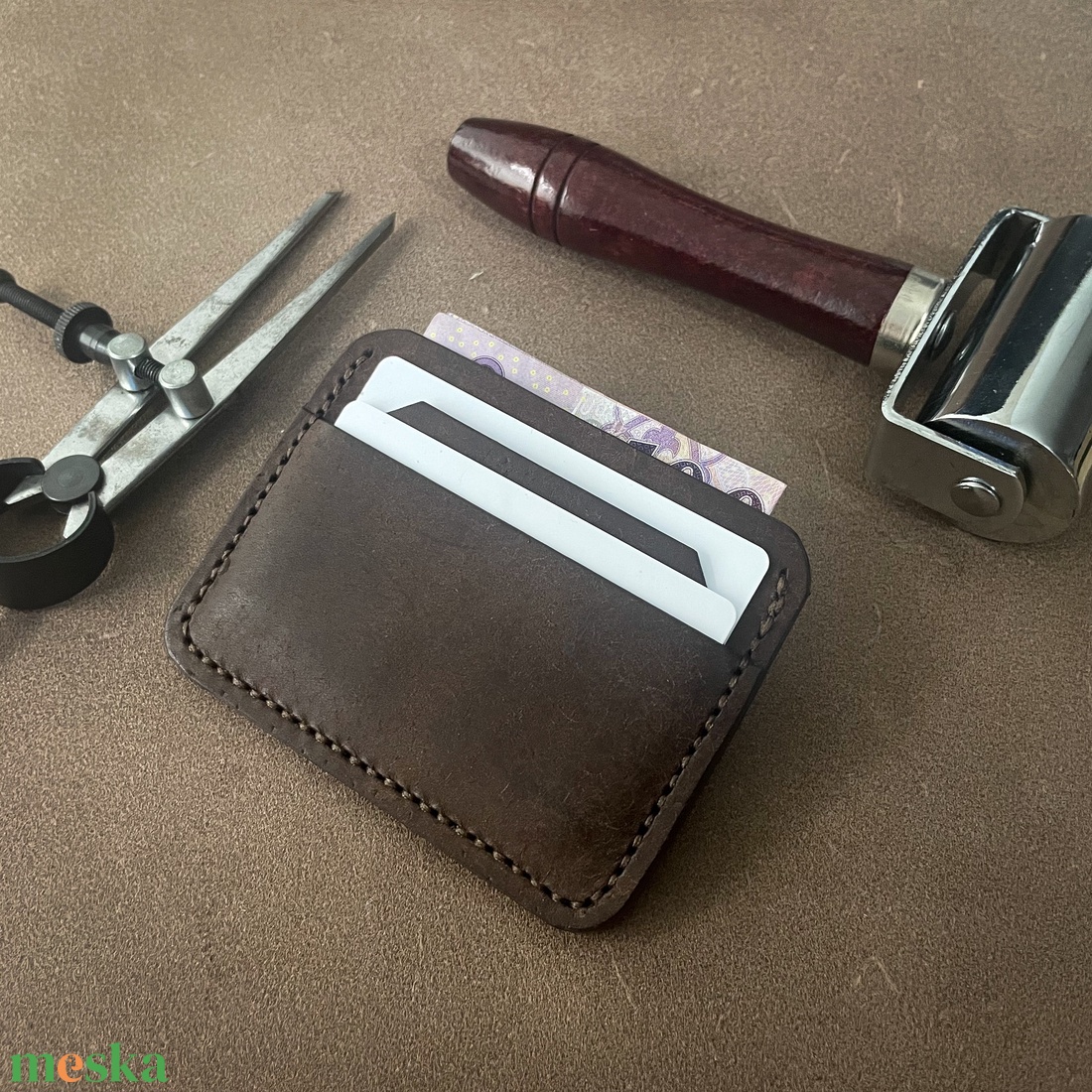 Elegáns férfi kártyatartó sötétbarna matt marhabőrből - személyre szabott ajándék - gravírozással