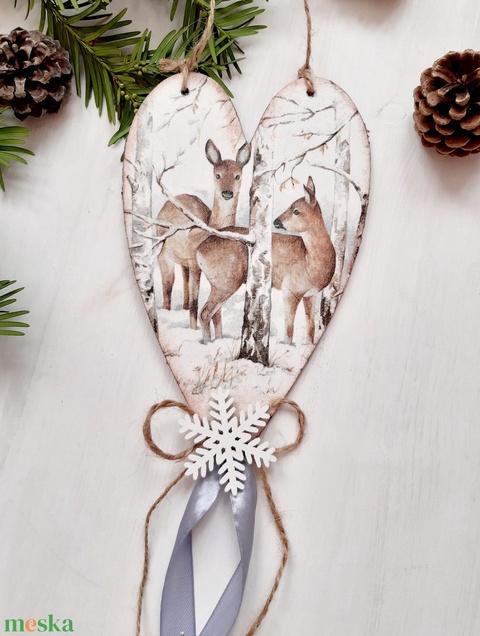 Őzek a hóban- szíves függődísz, adventi, karácsonyi dekoráció, ajtódísz