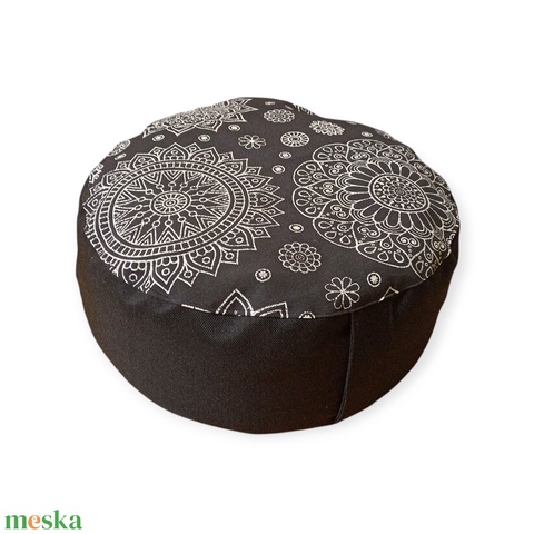 Meditációs, jóga ülőpárna tönköly pelyvával töltve, fekete-fehér mandalás
