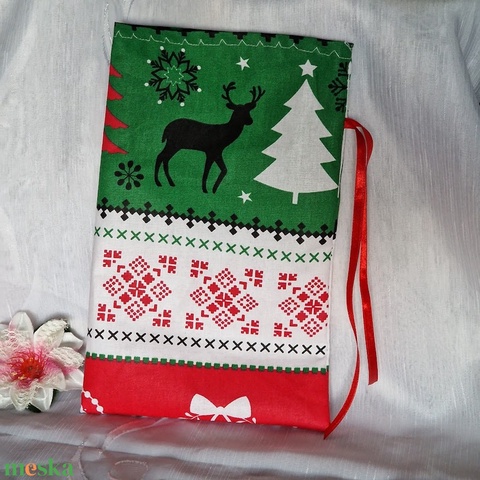 DCS51B - Karácsonyi fenyőfa, rénszarvas mintás mikulás zsák, textil ajándéktasak - zöld