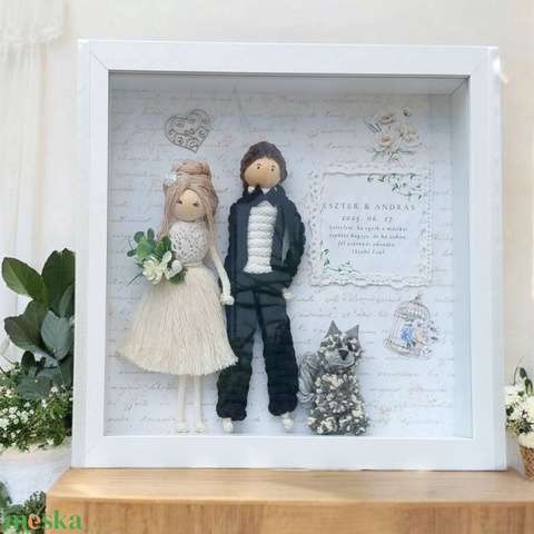 Személyre szabható makramé jegyespár 3D üveges képkeretben – elegáns esküvői ajándék házi kedvenccel