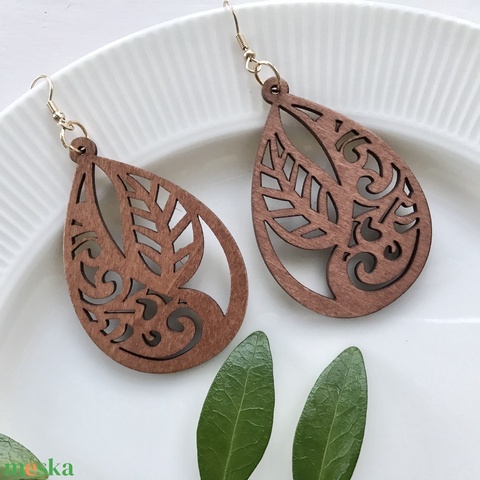 Természetes fa fülbevaló, áttört levél mintás - Mesedoboz