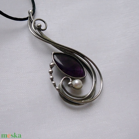 A medál Tiffany technikával készült ametiszt és ólommentes, ezüsttartalmú ón felhasználásával. A díszítés szintén saját készítésű, nem tartalmaz gyári elemeket. A fémrészt óezüstre patináztam, lekezeltem antioxidánssal és lelakkoztam, hogy sokáig szép maradjon.