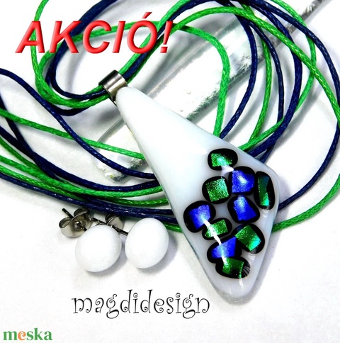 Fehér kék-zöld dichroic bordűrös üvegékszer szett nyaklánc pötty fülbevaló