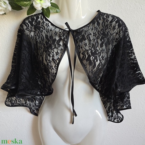 Fekete színű, szatén szegélyes csipkés alkalmi pelerin, válltakaró