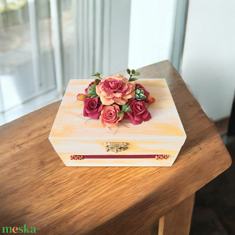 - Anyag/Összetevő fa doboz, szintetikus agyag, ragasztó, akrilfesték, élethű virág, gyöngy, szaténszalag, fű